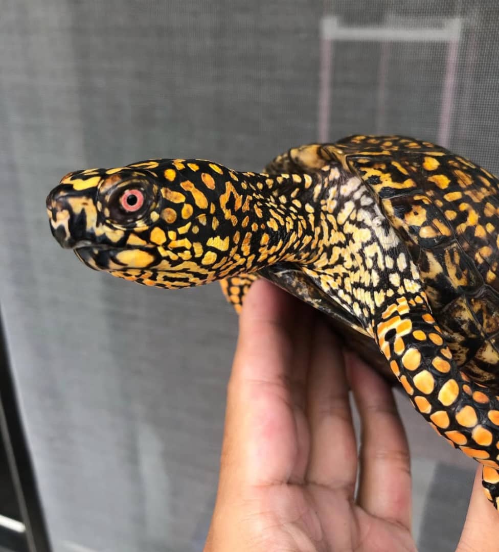 Eastern box turtle for sale have many uniquely identifying characteristics as part of the box turtle group. While the female’s plastron is flat, it is concave in males so the male may fit over the back end of the female’s carapace during mating. The front and back of the plastron are connected by a flexible hinge.