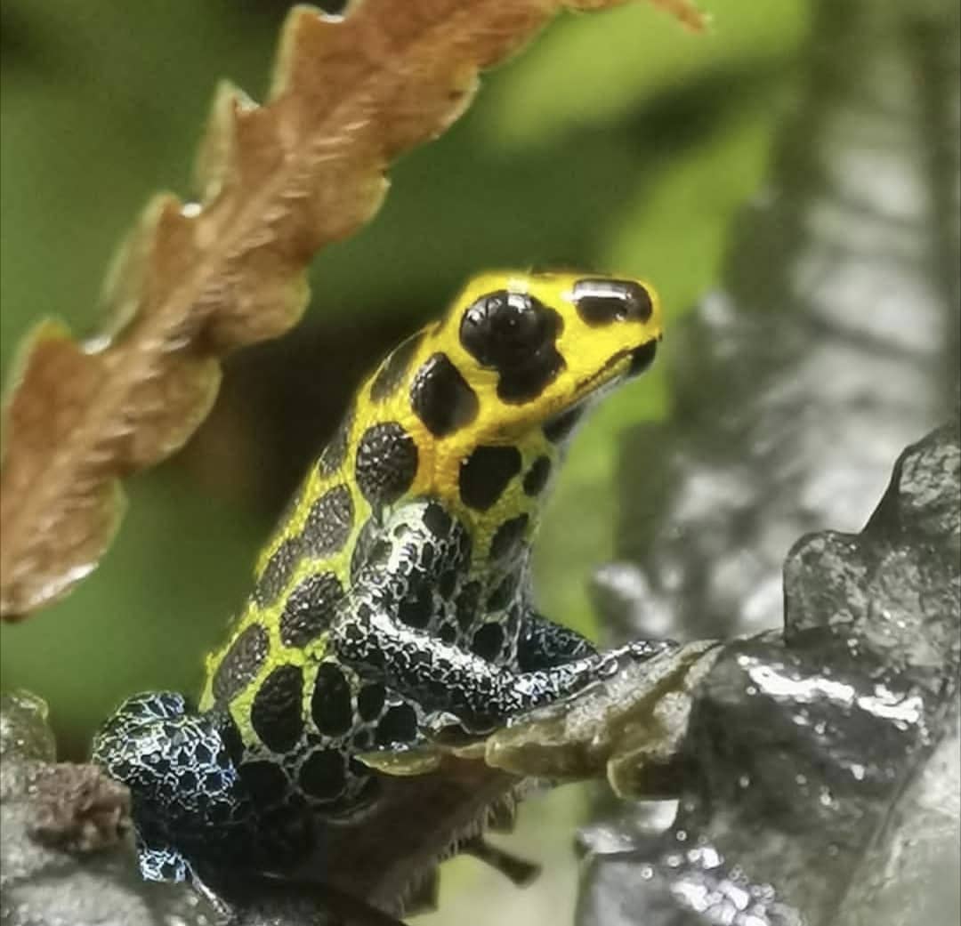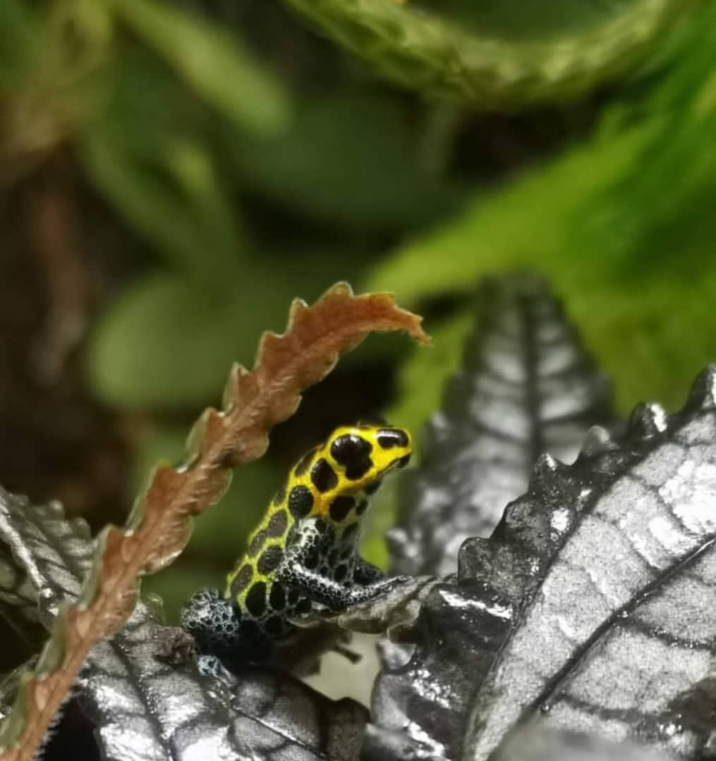 The spotted morph mimics the highland spotted frog Ranitomeya variabilis with mainly blue-green coloration, but can be found in other forms, sometimes in yellow.